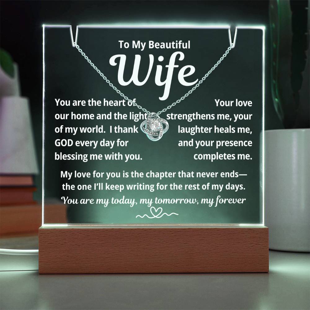 To My Beautiful Wife "You Are The Heart of Our Home.." Lighted Acrylic Keepsake with Love Knot Necklace